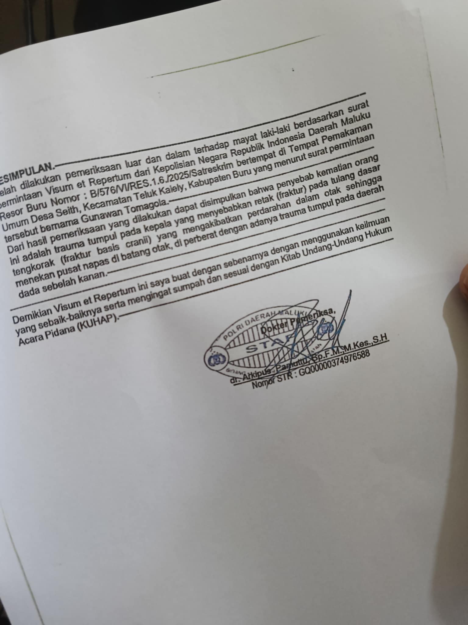 Sebagaimana pernah diberitakan, Polres Buru tanggal 26 Juni lalu, mendatangkan dokter forensik terbaik dari RS Bhayangkara Ambon Polda Maluku guna melakukan Otopsi terhadap korban penganiayaan, Gunawan Tomagola, warga Desa Seith, Kecamatan Teluk Kaiely, Kabupaten Buru yang terjadi tanggal 6 Juni 2025 lalu.