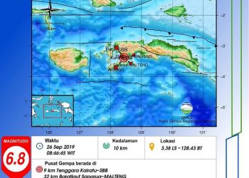 Lensa Maluku – Gempa magnitudo 6,8 mengguncang Kota Ambon, Maluku, Kamis (26/9/2019). Data Badan Meteorologi, Klimatologi, Geofisika (BMKG) Maluku yang...