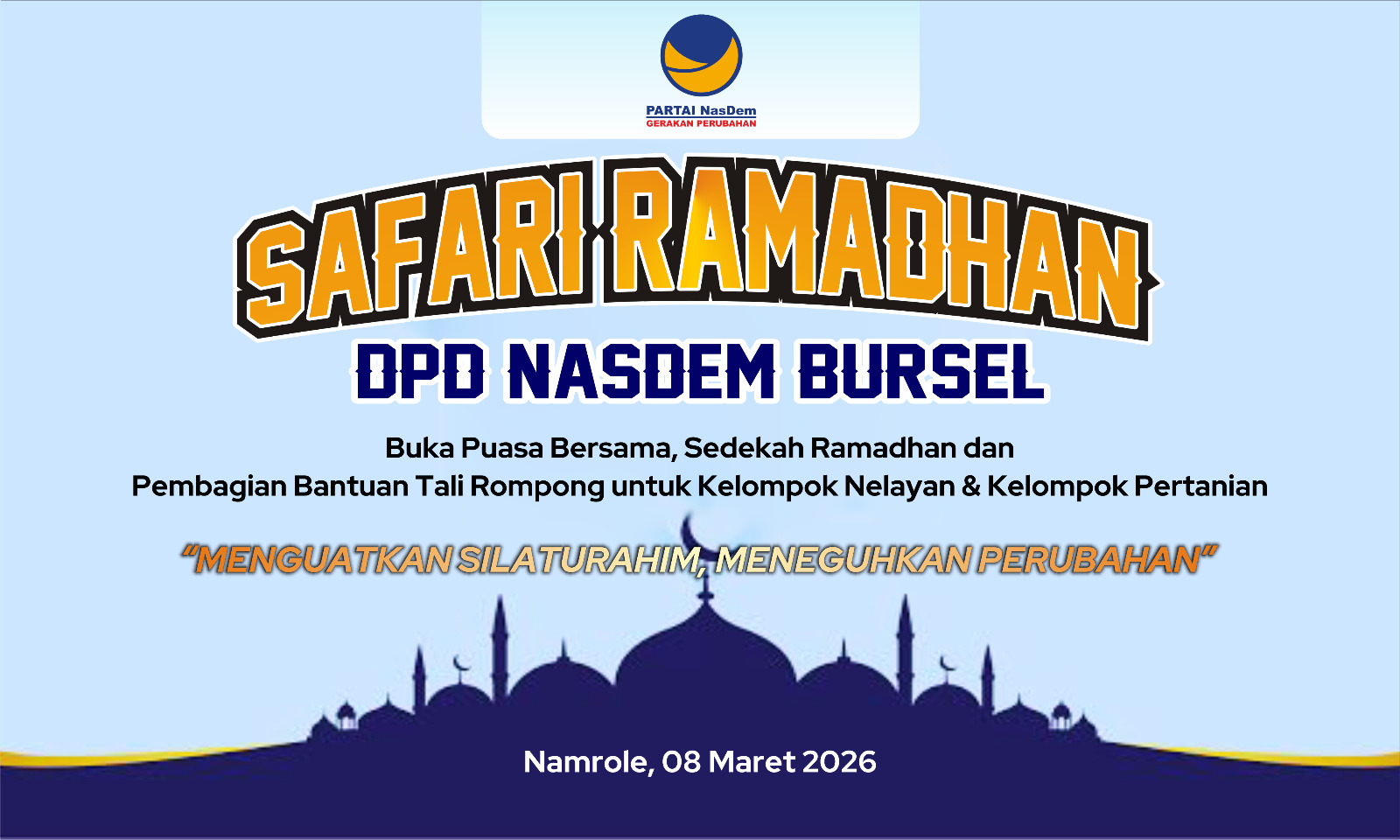 Lensa Maluku – Namrole, 8 Maret 2026-Dewan Pimpinan Daerah (DPD) Partai NasDem Kabupaten Buru Selatan hari ini akan menggelar kegiatan Buka Puasa Bersama yang dirangkaikan dengan aksi sosial Sedekah Ramadhan, Minggu (8/3/2026) sore hingga menjelang waktu berbuka puasa di Namrole. Kegiatan tersebut berlangsung dalam suasana penuh keakraban dengan mengusung tema “Menguatkan Silaturahmi, Meneguhkan Perubahan.”