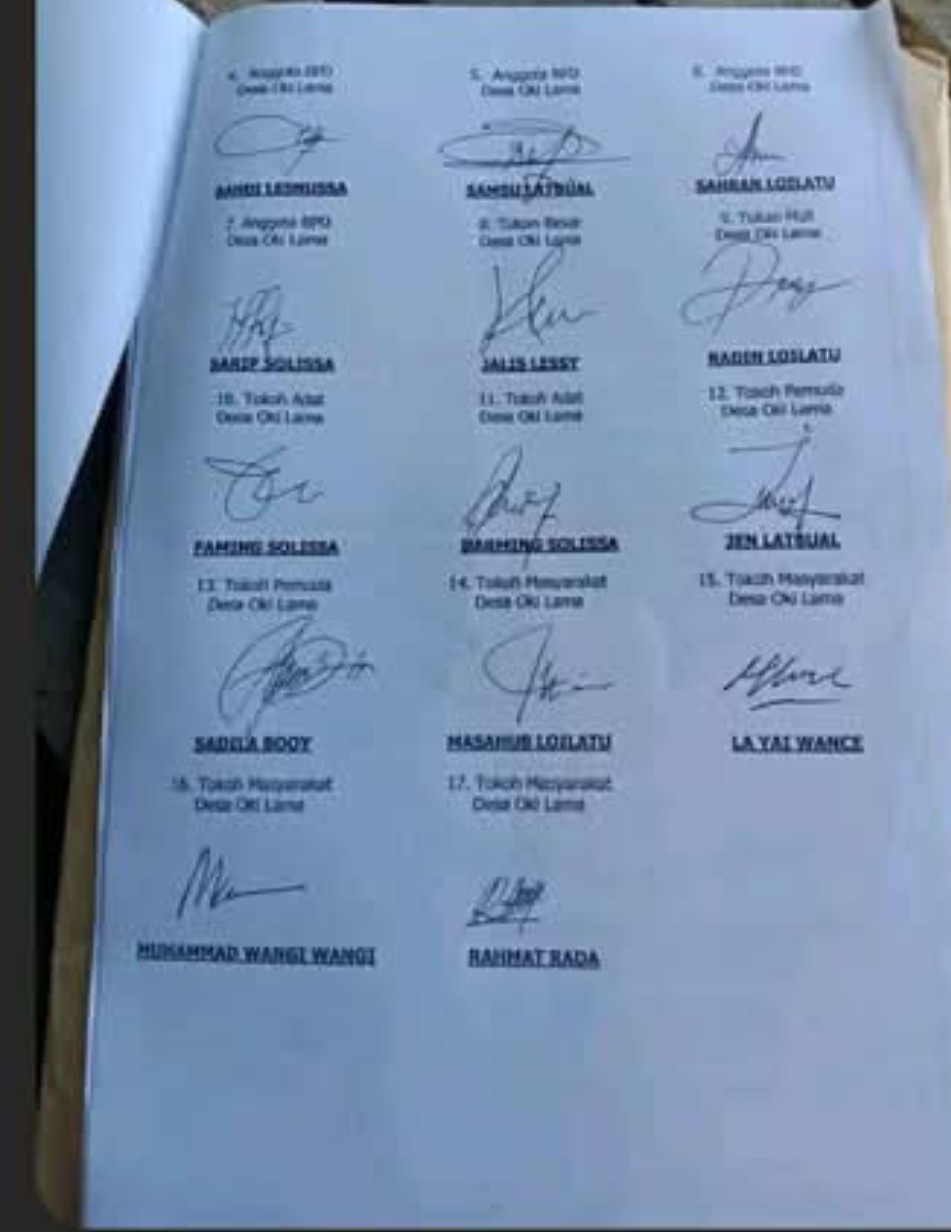 Parahnya lagi dalam Documen dukungan pergantian PJ Kades Oki Lama salah satu nama yang tertera lengkap dengan tanda tangannya yakni inisial RL, RL menolak keras atas bubukan tanda tangan tanpa ada kesepakatan bersama. “Saya akan laporkan pemalsuan tanda tangan saya ke Polres Namrole”