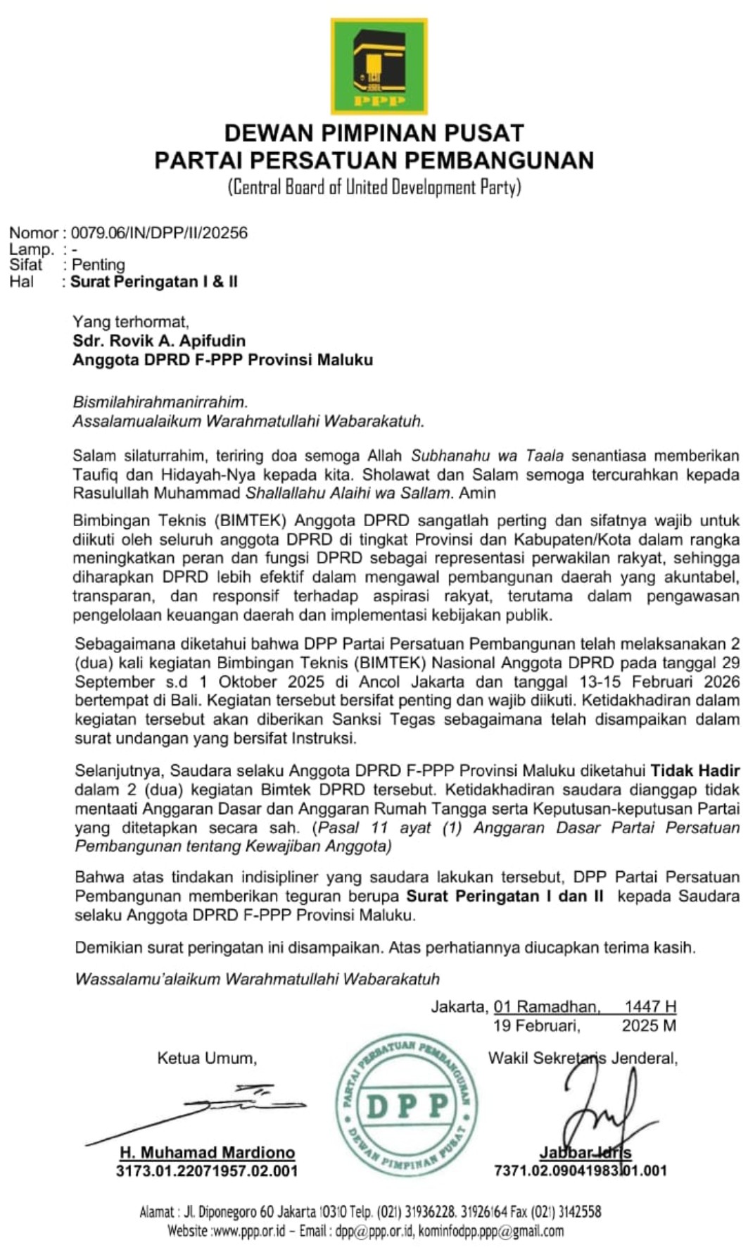 Dalam Surat Peringatan yang di tandatangani Ketua Umum DPP PPP Muhammad Mardiono tertanggal 19 Ferbruari 2026 itu, mantan sekertaris wilayah PPP Maluku itu, dinilai telah melakukan tindakan pembangkangan terhadap instruksi partai untuk mengikuti Bimbingan Teknis (Bimtek) Nasional, yang telah di selenggarakan DPP PPP sebanyak 2 (dua) kali.