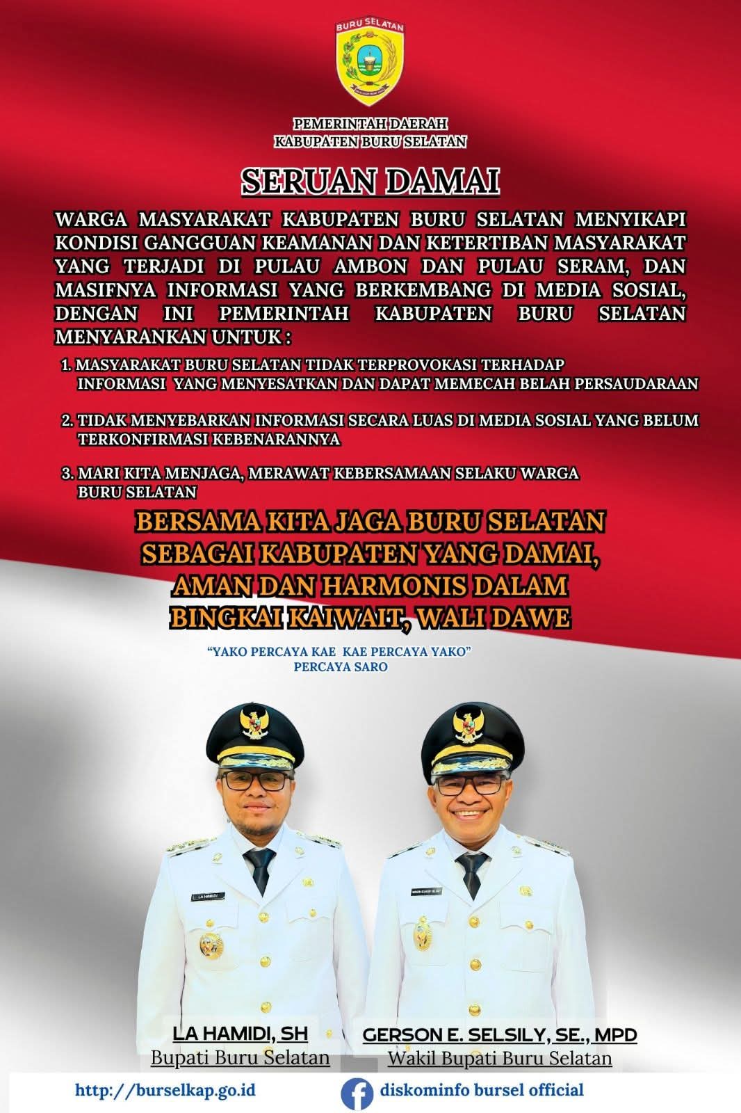 “Dimana melihat perkembangan situasi di Kabupaten Malteng ada sebuah kekhawatiran, untuk itu kami menyampaikan pesan kepada masyarakat Maluku secara umum untuk mari kita berdamai dan lebih khusus kepada masyarakat Bursel, untuk kita jangan mudah terpovokasi dengan isu-isu provokatif yang dapat menghancurkan persatuan pela dan gandong yang selama ini terpelihara dengan baik di Maluku, ” ujar La Hamidi.