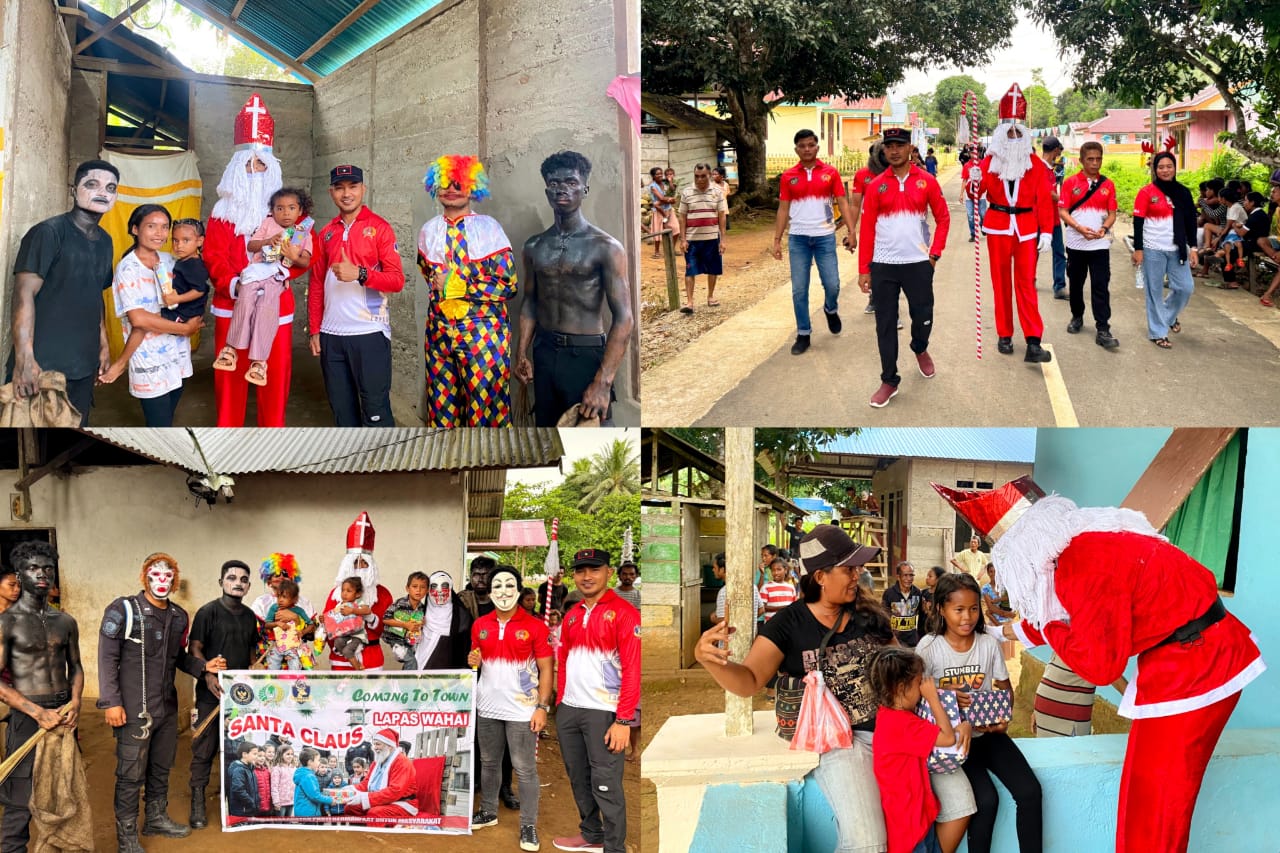 Kali ini keceriaan datang dari inisiatif unik Lembaga Pemasyarakatan (Lapas) Kelas III Wahai, dimana Para Petugas Lapas mengenakan kostum Santa Claus dan perankan tokoh lainnya, untuk membagikan bingkisan Natal kepada 70 puluh anak-anak setempat, Sabtu (13/12).