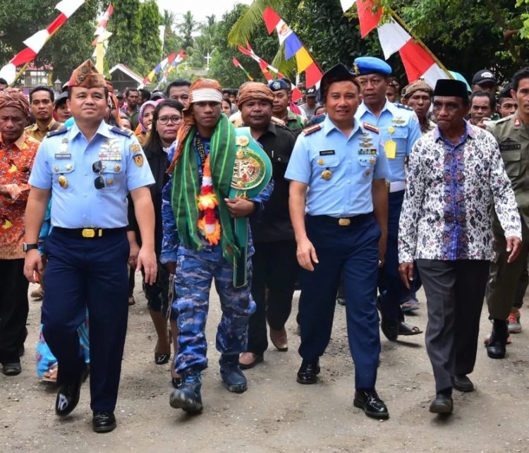 Lensa Maluku – Pratu Ongen Saknosiwi Juara Dunia Tinju Kelas Bulu Versi WBC Asian Boxing Council Continental (ABCC) pulang ke kampung halamannya di Desa Waenibe Kecamatan Fenalisela Kabupaten Buru, Maluku pada Selasa (17/9/2019).