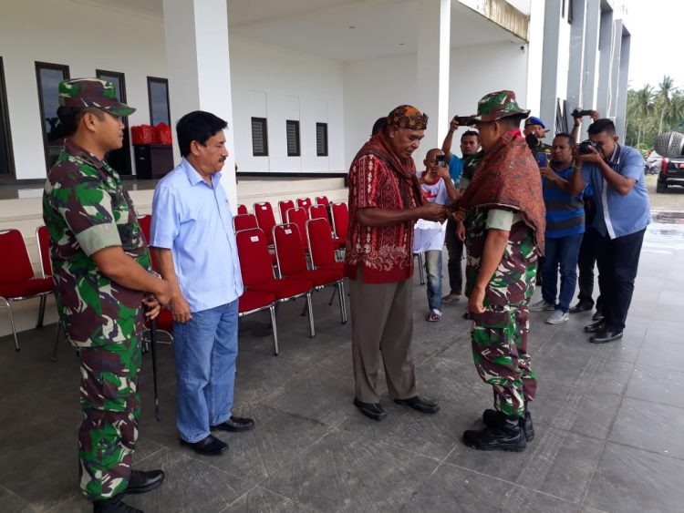 Penerimaan Satgas BKO Kodim Persiapan Buru Selatan ini diterima dengan pengalungan Kain Adat (Lestari) oleh tokoh adat sebagai tanda penghargaan dan selamat datang di daerah Bursel