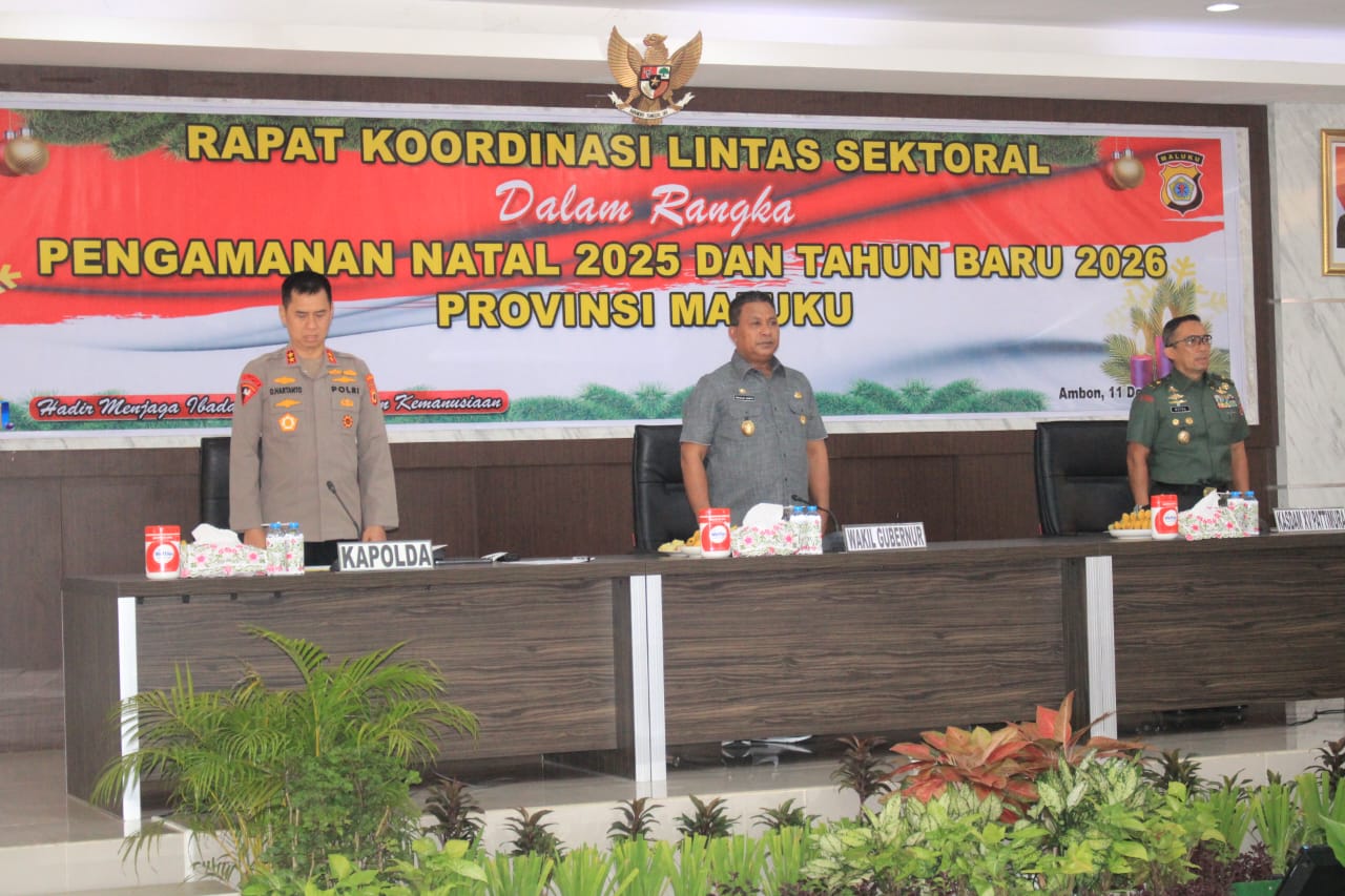 Lensa Maluku, — Wakil Gubernur Maluku, H. Abdullah Vanath, menghadiri Rapat Koordinasi Lintas Sektoral dalam rangka Pengamanan Natal 2025 dan Tahun Baru 2026 tingkat Provinsi Maluku. Kegiatan tersebut berlangsung di Aula Lantai 5 Gedung A Polda Maluku pada Kamis (11/12).